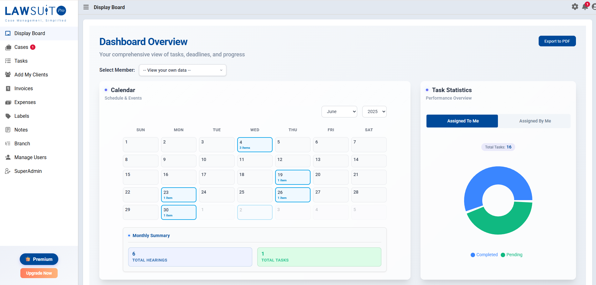 An advanced legal case management system tailored for individuals, law firms, and enterprise users.It offers role-specific dashboards, real-time case tracking, task assignment, and secure document management